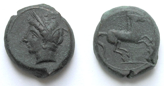Die Pferde der Punier sind nicht nur im Herrschaftsbereich Karthagos auf Münzen gelangt, sondern auch während kriegerischer Auseinandersetzungen im Ausland von wandernden Münzstätten geprägt worden, die sich mit dem Heer bewegten. Diese Prägungen dienten vermutlich zur Bezahlung der karthagischen Söldner. Aus den Kriegen auf Sizilien, insbesondere gegen Syrakus, möchte ich hier ein Stück vorstellen, das – wenn ich das richtig deute - die Kunst griechischer Stempelschneider mit karthagischen Motiven vereint.