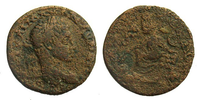 Die Rs. ist eine der vielen, die Tyche zeigt, auf einem Felsen sitzend, mit Mauerkrone (also eine Stadttyche) und in der Hand vielleicht Getreideähren. Zu ihren Füßen ein Flußgott nach li.(?) schwimmend. Mit den vielen kleinen Attributen im Feld könnte es Antiochia in Syrien sein. Das hat S - C und Delta - E in den Feldern.