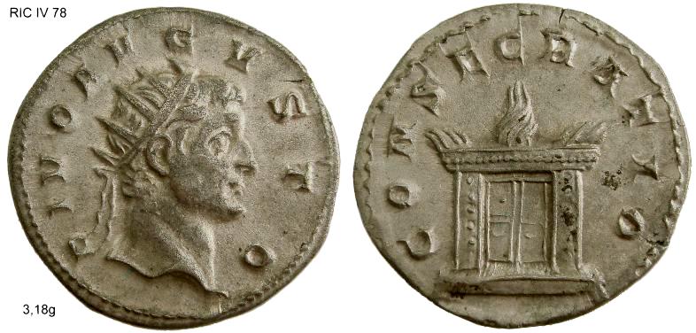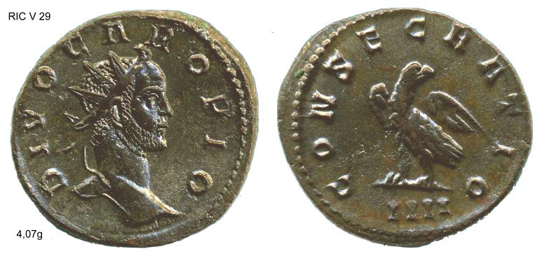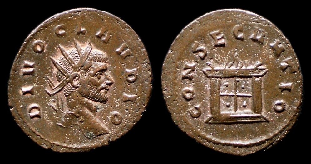 Da auf dieser Seite schon sowohl Claudius II. und Faustina I. gezeigt wurden, kann ich hier zu beiden schöne Münzen beisteuern, die etwas gemeinsam haben: Beide haben ein AE als Besonderheit, nämlich für Faustina die sehr seltene Vs.-Legende im Dativ "DIVAE FAUSTINAE" und für Claudius (hier ein ausgesprochen schön und sorgfältig geprägtes Stück aus Siscia) die Rs.-Legendenvariante "CONSAECRATIO".