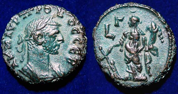 Rv. Tyche (Fortuna) mit Füllhorn und Ruder steht links, am Kopf Polos(?) im Feld L und gamma