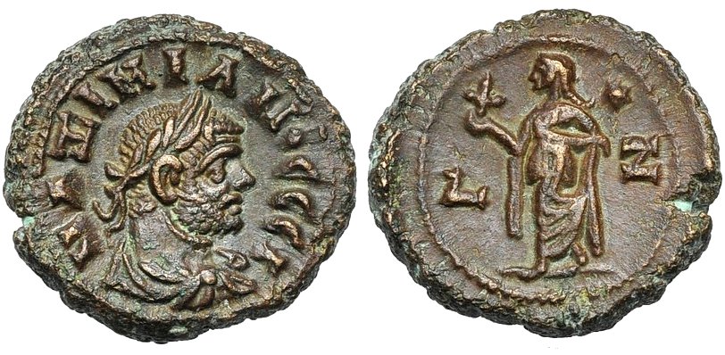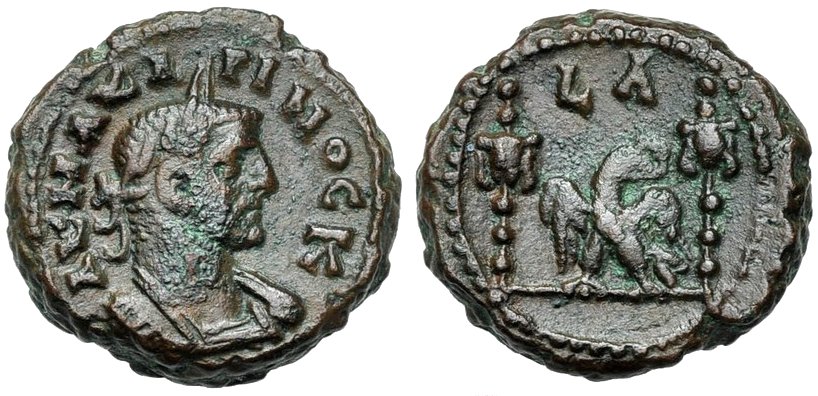 Dattari 236. Förschner 141f. Geißen 200f. Emmett 122 (sehr häufig). Kamp./Gansch. 74.110. SNG Cop. 132. RPC 5315.Im 13. Und 14. Regierungsjahr Neros finden wir ein Bündel von interessanten Rückseitentypen, die auf die Griechenlandreise des Kaisers anspielen und au seine Siege bei den verschiedenen panhellenischen Wettbewerben. So ist der ΣΕBAΣTOΦOPOΣ, der Kaiserträger, also das Schiff, das Nero nach Girechenland brachte, auf Rückseiten alexandrinischer Tetradrachmen dargestellt. Die Darstellungen von Apollon Aktios, Apollon Pythios, Hera Argeia (aus Argeios), Poseidon Isthmios, Zeus Nemeios und Zeus Olympios verweisen auf die Spiele, an denen Nero teilnahm – und die er selbstverständlich auch gewann (Kampmann.)