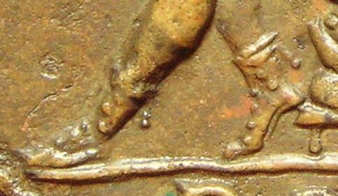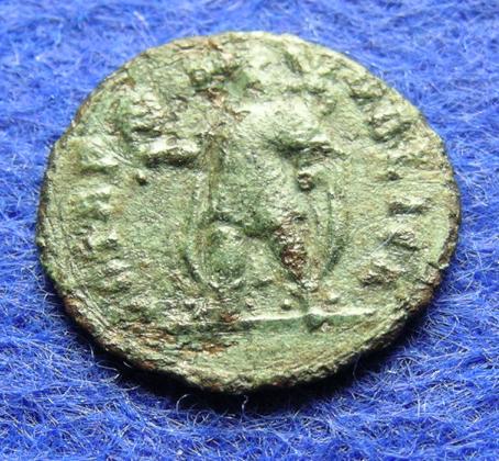 Die Münze ist eigentlich nicht schlecht in der Erhaltung, jedenfalls um Längen besser als das Stück, das ich auf der letzten Seite vorgestellt hatte. Einige Details sind sehr gut erkennbar, z.B. daß Anubis mit Troddeln verzierte Stiefel trägt, ähnlich wie die Roma auf meinem Nero-Sesterzen. Das Problem ist, daß - ich weiß nicht, warum - diese Spätrömer fast nie eine ungestörte Patina entwickeln; die haben alle Auflagerungen, Abplatzungen etc. Deswegen sind sie schwer zu fotografieren. In der Hand bewegt man sie hin und her, dreht sie ins Licht und hat dann ein zusammengesetztes Bild im Kopf.