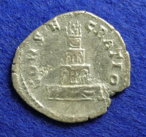 Sehr hübsche frühe Faustina II! Eine Münze dieses Typs habe ich auch, aber schwer zu fotografieren, da etwas korrodiert und sehr helles Silber. Ebenso wie das folgende Stück, RIC MA 747, posthum mit Scheiterhaufen auf der Rückseite. Die hatten wir, glaube ich, hier noch nicht. Mit 2,25 g ist dieses Exemplar recht untergewichtig.