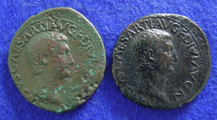 Dargestellt ist Drusus junior, Sohn und designierter Nachfolger des Tiberius, der 23 nach Chr. einer Intrige des Sejanus zum Opfer fallen sollte. 22-23 wurde eine Emission Asse (RIC Tib. 45) ausgegeben, die den Thronerben vorstellte. Sowohl diese Asse als auch die Restitutionsmünzen dieses Typs unter Titus sind in der Literatur ausschließlich mit Linksporträt verzeichnet. Nachdem ich vor einem Jahr eine solche Münze mit Rechtsporträt erwerben konnte, die CNG beim Katalogisieren durch die Lappen gegangen war (verkauft als RIC 45), war ich doch relativ baff, als jetzt ein Exemplar auf Ebay Deutschland auftauchte. Beiliegend Fotos vom Wiedersehen der Münzen nach 1988 Jahren Trennung. Rechts das CNG-Exemplar, links die Ebay-Münze.