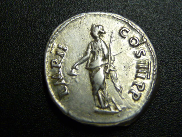 Das rechts zur Seite Dianas ist wohl ihr wehendes Gewand; für ein Exemplar vom selben Rs.-Stempel siehe http://www.acsearch.info/record.html?id=157896. Leider habe ich noch kein Exemplar gesehen, das gut genug erhalten wäre, um auf Dianas frontalem Gesicht Einzelheiten zu erkennen - auch nicht auf der Bildtafel im RIC.