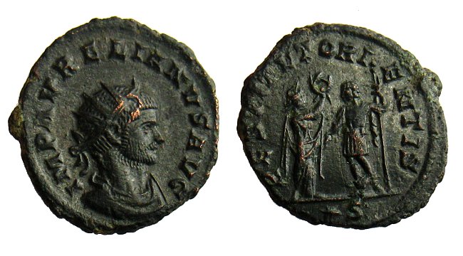 Rv.: RESTITVT ORIENTIS; Frau, n. re. stehend, überreicht Aurelian, mit Szepter, einen Kranz.