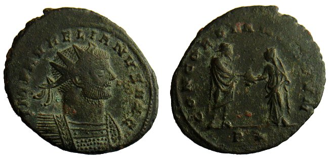 Rv.: CONCORDIA MILITVM; Aurelianus im Handschlag mit Concordia. Unter den Händen Punkt.