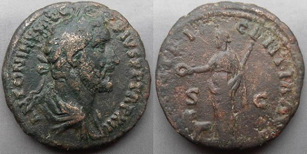 Eine Besonderheit bei den Geprägen von Antoninus Pius ist, dass die Büstendarstellung zumeist nur mit Lorbeerkranz ist, selten mit Drapierung, wie auf meinem Stück.
