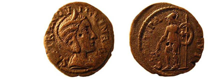 R: COL - FL PA - C DEVLT - Minerva (Athena) mit korinthischem Helm n.l. stehend, hält Speer, Schild und Zweig