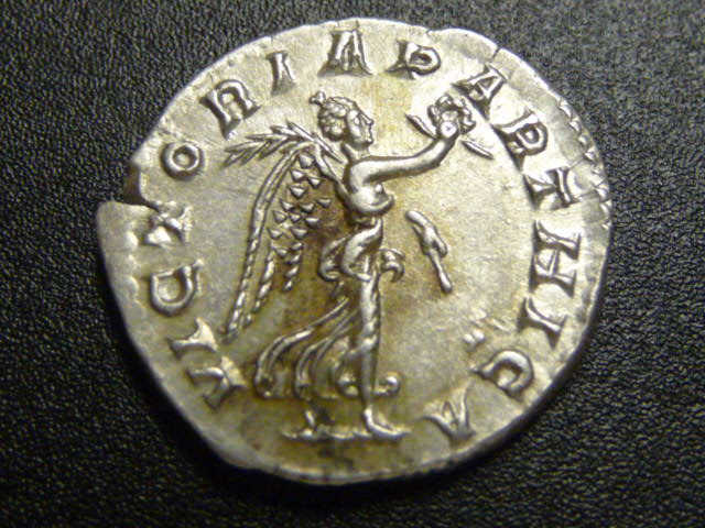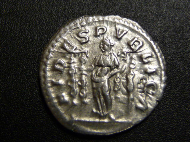 "A rare denarius shows the Fides type with the legend FIDES PVBLICA, but this is probably only an engraver's slip for FIDES MILITVM. The three specimens of this coin that I have seen all come from a single reverse die (BMC 5, pl. 78.12; Vienna 15846; Kress 166, 1976, 1018)."