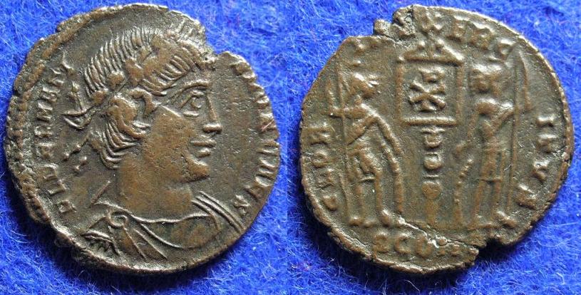 Der Constantin II. aus Aquileia ist als r4 eingestuft, die Bewertung ist nur im RIC eine Zeile zu hoch gerutscht. Ich habe ein Exemplar von RIC 124 für Constantin I., und es ist in der Tat eindeutig ein Kreuz, nicht ein T, wie es auf manchen Münzen scheint.
