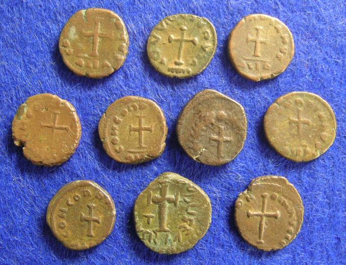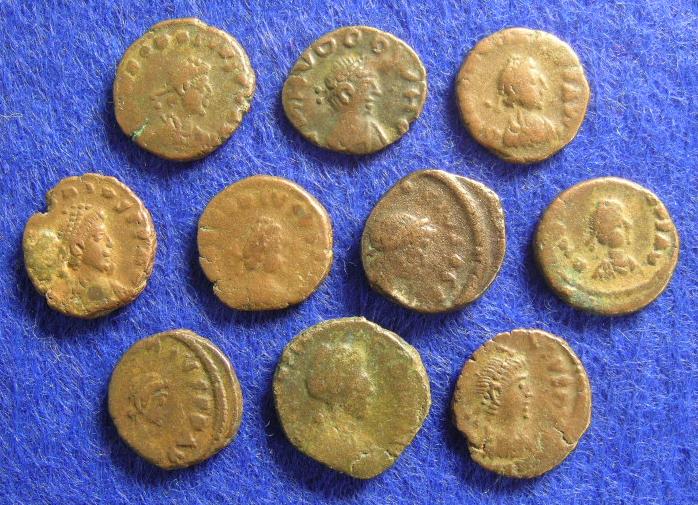 Heute ist bei mir dieses interessante Lot Spätrömer eingetroffen, alle mit Rückseite "Kreuz und sonst nichts". Leider wird daran auch mal wieder das Elend der spätrömischen Bronzeprägung deutlich: auf kaum einer Münze sind die Legenden komplett entzifferbar, im 5.Jh. gab man sich nur noch bei Goldmünzen Mühe, die Bronzen wurden irgendwie hingeschlampt, wahrscheinlich wurde hauptsächlich mit irgendwelchen älteren Geldstücken bezahlt.