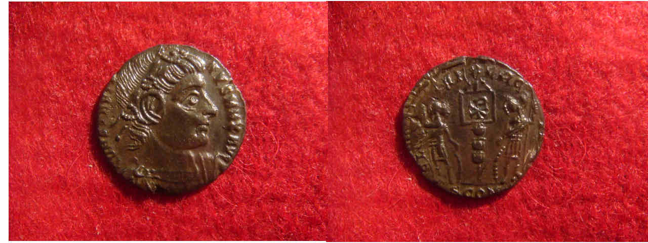 constantin war mit ziemlicher sicherheit kein christ, aber ,' in hoc signo vinces', hat er den glauben einer vielzahl seiner soldaten und untertanen, geschickt ausgenützt, und wenn er angeblich das labarum auf die schilder seiner jungs hat malen lassen, warum sollte es dann nicht auch auf seinen münzen auftauchen?