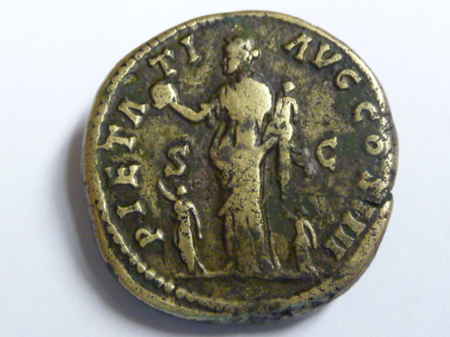Soviel ich herausfinden konnte, wurde dieser Sesterz 160 geprägt und feiert die Geburt von Annia Galeria Aurelia Faustina, Tochter der Faustina Junior welche die Frau des Marc Aurel war. also einem Enkelkind von Antoninus Pius.