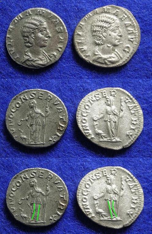 Curtis hat noch eine Eigenheit bemerkt: Auf der Rückseite der Mamias-Münzen steht Iuno anders als z.B. auf Müpus Münze. Ich habe einmal die Beinachsen eingezeichnet; auf dem normalen Typ steht Iuno normal nach li., also von sich aus gesehen nach rechts. Das re. Bein ist als Standbein belastet, das li. Bein ist das Spielbein. Auf dem Mamias-Denar ist es andersherum: das li. Bein ist belastet, das re. Bein entspannt, und die Göttin dreht den Oberkörper. Münzen mit li. Standbein, aber normaler Legende, sollen auch bekannt sein; das sind dann wohl die ersten Münzen nach der Legendenänderung gewesen, bevor auch die Rückseitenfigur gering modifiziert wurde.