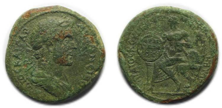 Die Münzen sind sehr selten. Hier habe ich eine Zeichnung von Antoninus Pius Schultz 103, geprägt unter demselben Magistrat. Die Vs. ist mit einer identisch (sog. V2). Die Münze in Schultz ist so abgenutzt, daß das Bild von der Rs. nicht zu gebrauchen ist. Diese Zeichnung habe ich auf einer Bibelseite gefunden! Dieser Typ hat im li Feld die Inschrift Q(E)M / ICTOKLH / (C). Wir haben lange versucht diese Inschrift mit der auf dem Schild zur Deckung zu bringen. Jetzt mit 4 Buchstaben in der 2. Zeile könnte man ja einen neuen Anfang machen. Jedenfalls ist das nach einem Jahr der erste Schritt nach vorne. Das QEM am Anfang springt einem ja förmlich ins Auge. Aber was kommt dann?