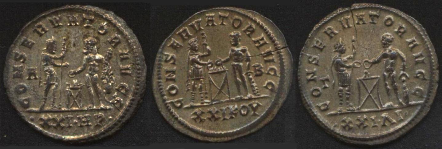 :arrow: interessant ist ebenfalls die Tatsache, daß sich diese "Codes" anscheinend nur auf den Antoninianen VOR der Münzreform finden, oder gibt es auch diese Codes auf den postreformen Antoninianen/Radiati, bei den Follisgeprägen dürfte ja dieser Code nicht mehr verwendet worden sein.