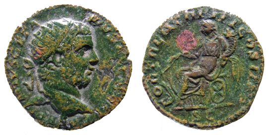 Vom Raeticus im deutschen Forum habe ich vor ein paar Monaten einen Dupondius des Geta vom selben Vs.Stempel bekommen, mit Rs. VICT BRIT TR P III COS II S C. Hier das schöne Bild davon, bevor etliche Reparaturen entdeckt und entfernt wurden!