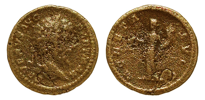 ich hätte da ein "Münzlein", zu dem ich gerne eure Meinung einholen würde, bevor ich sie entgültig archiviere! Es handelt sich um einen goldglänzenden Denar des "Septimius Severus", zu dem ich in der Literatur nur ein Beispiel, nämlich RIC 162 finden konnte. Wie die Oberflächenstruktur nahelegt, scheint er gegossen zu sein. Es könnte also eine antike Fälschung eines Aureus sein. Dem widerspricht allerdings der zu kleine Durchmesser und das äußerst geringe Gewicht, welches allenfalls im Bereich eines stark untergewichtigen Goldquinars liegt. Meine Frage: Kann es sich bei dem Material, aus dem die Münze gegossen zu sein scheint, um Aurichalcum* handeln?