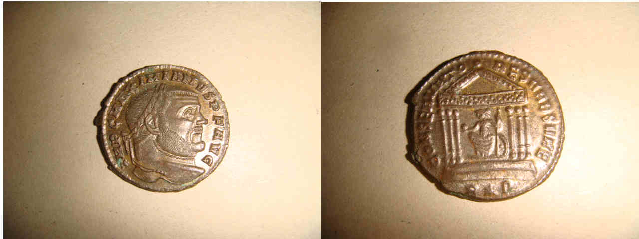 2) Av.: Büste des M.mit Lorbeerkranz, IMP.C.MAXIMIANUS P.F.AUG., Rv.: Romatempel, CONSERVATORES URB. SUAE, Im Abscnitt: R*P.