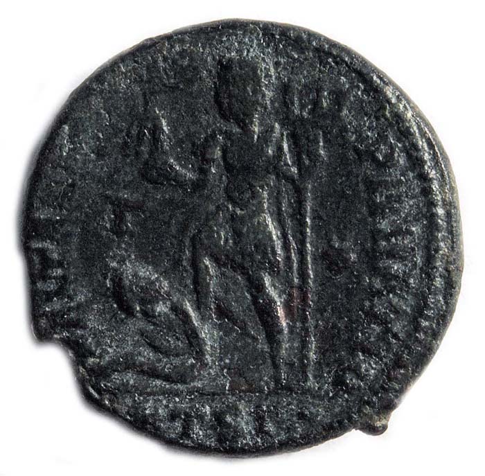 FEL TEMP RE-PARATIO - Emperor in military dress advancing left holding Victory on globe and a standard with chi-rho on the banner. With his right foot he spurns (kicks) a seated captive