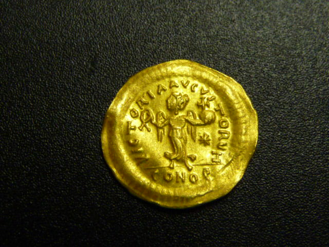 es handelt sich nicht um einen Tremissis von Justinus II., sondern von Justinus I. (518-527), Sear 58, MIBE 5. Die Typen unterscheiden sich nicht durch eine allenfalls abweichende Legende (ist bei beiden gleich - Schluss-C mehr oder weniger klar), sondern durch den Stil. Justinus I. ist viel "naturalistischer". Vgl. auch die Abbildung unter http://www.wildwinds.com/coins/sb/sb0058.html.