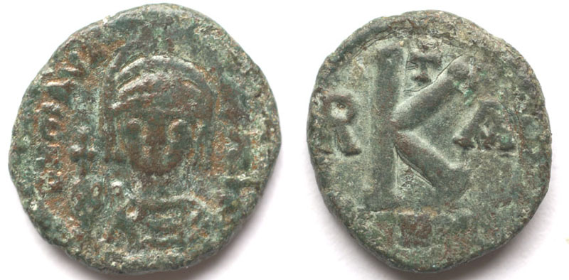 Es handelt sich hier um 1/2 Follis des Mauricius aus der Münzstätte Ravenna. Auf dem Revers der Münze ist links neben der "griechischen" Wertziffer "K" ein R und rechts ein A erkennbar, darunter " VEN(N)" erkennbar -auf dem Bild nur schwach-. Es handelt sich um eine Prägung der 2. Emission.