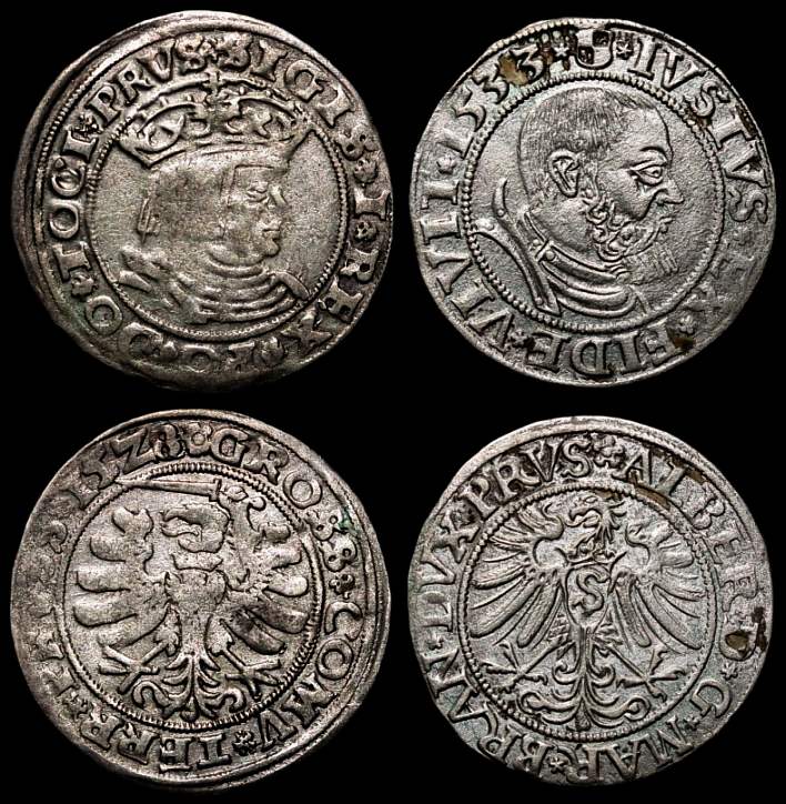 Damit dieser Beitrag aber nicht ganz in der Gegenwart stehen bleibt, stelle ich den in der Anm. genannten Lehnsherrn Sigismund I., König von Polen und seinen Neffen und Lehnsmann Albrecht, Herzog von Brandenburg hier im zeitgenössischen Münzbild in verschiedenen Lebensaltern vor.
