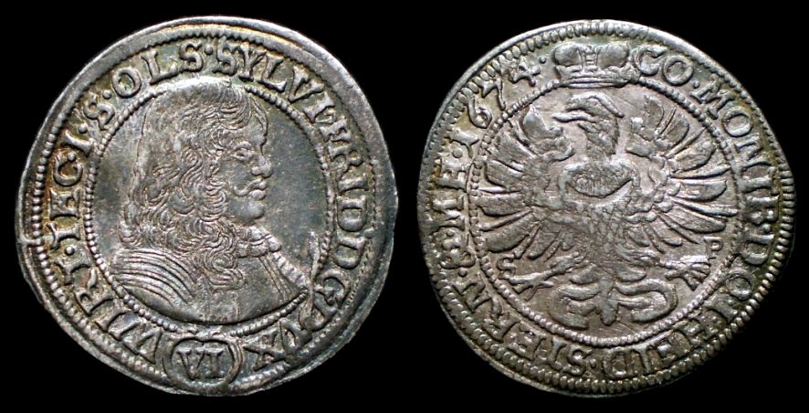 Die Daten: Schlesien - Württemberg-Oels, Sylvius Friedrich, 1664 - 1697. 6 Kreuzer 1674, Oels. Brustbild rechts. Rs. Adler. FS. 2295.