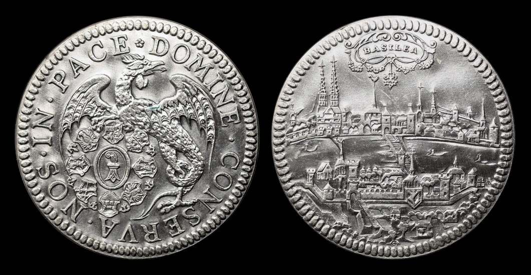 Beifügen möchte ich einen weiteren Baseler Taler als Replik, u.a. weil er die Stadt aus einer anderen Perspektive zeigt. Er gehört zu einer Serie Repliken von Schweizer Talern, von der die Zs. „Die Münze“ Ende der 70-er Jahre berichtet hat.