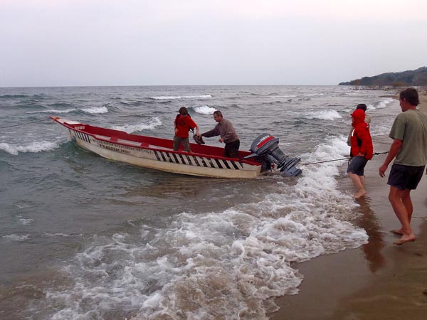 Für den nächsten Tag war die Rückfahrt vorgesehen, nun musste sich zeigen ob unsere bestelltes Boot kam oder ob der Bootsführer mit der Anzahlung zufrieden war und uns im Stich ließ. Bereits am Abend zerstreuten sich unsere Befürchtungen, am Strand lag unser bestelltes, mit etlichen Kanistern Benzin beladenes Boot samt Bootsführer. Also war die Rückfahrt gesichert, wenn auch nicht in einem Speedboot wie versprochen sondern ehr in einem hölzernen Ausflugskutter.