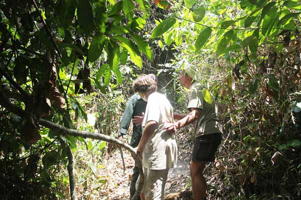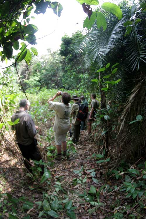 Auf dem Weg zu den Hütten erzählte uns der Ranger das wir großen Glück hätten da eine Schimpansenfamilie nur eine Stunde Marsch von hier gesichtet wurde. Er empfahl unverzüglich aufzubrechen. Also kurz das Gepäck verstauen, festes Schuhwerk anlegen und los ging es. Bereits nach 20 Minuten in einer mit Wasser gesättigten Luft war ich durch und durch Nass geschwitzt. Wenn das so weiter ging würden unsere Wasservorräte nicht lange reichen.