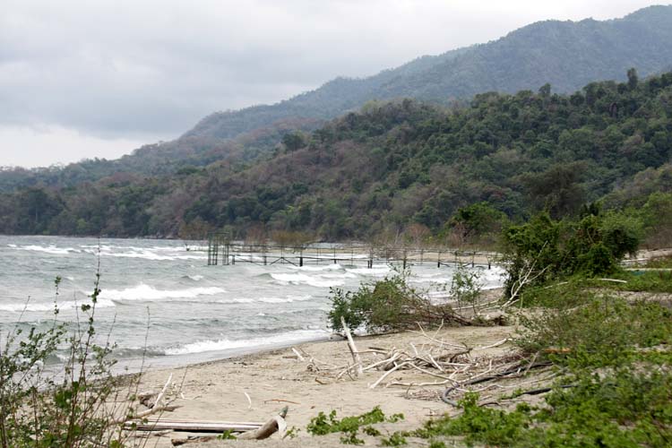 Nachdem wir die Liemba verlassen hatte fuhren wir 1 bis 2 Stunden in absoluter Dunkelheit auf dem See, mir war völlig unverständlich wie der Bootsführer sich orientieren konnte, Sterne waren keine zu sehen. Irgendwann, inzwischen völlig durchnässt von der Gischt, konnte ich ein einzelnes Licht in der Dunkelheit ausmachen, hierauf hielt das Boot nun zu. Nach einer weiteren Stunde (gefühlt), inzwischen hellte sich der Horizont auf, so dass die Silhouette der Bergkette erkennbar wurde, erreichten wir das Headquarter der Parkverwaltung. Da noch niemand anwesend war, bedeutete uns unser Bootsführer hier am Strand zu warten. Nach einer weiteren Stunde erschien ein Mitarbeiter des Parks und nahm uns mit ins Office wo wir unsere Parkgebühren bezahlen konnten, gleichzeitig teilte er uns mit, dass wir nochmals mit dem Speedboot ca. 45 Minuten Richtung Süden zu unseren Unterkünften fahren müssten. Nungut, das nahmen wir auch noch hin, inzwischen waren wir schon 22 Stunden unterwegs. Also wieder ins Boot und Richtung Süden auf die letzte Etappe. Nach knapp einer Stunde landeten wir erneut an einem Sandstrand und luden unser Gepäck aus. Sogleich erschien auch ein Ranger aus dem dichten Wald und begrüßte uns freundlich, er führte uns in das ca. 100-200 Meter vom Strand gelegene Camp. Hier konnten wir unsere Hütten beziehen. Einfache Steingebäude mit einer Holztüre, einem Wellblechdach und Insektennetzen in den Fensteröffnungen aber mit einem richtigen Bett! Ansonsten waren die Gebäude leer!