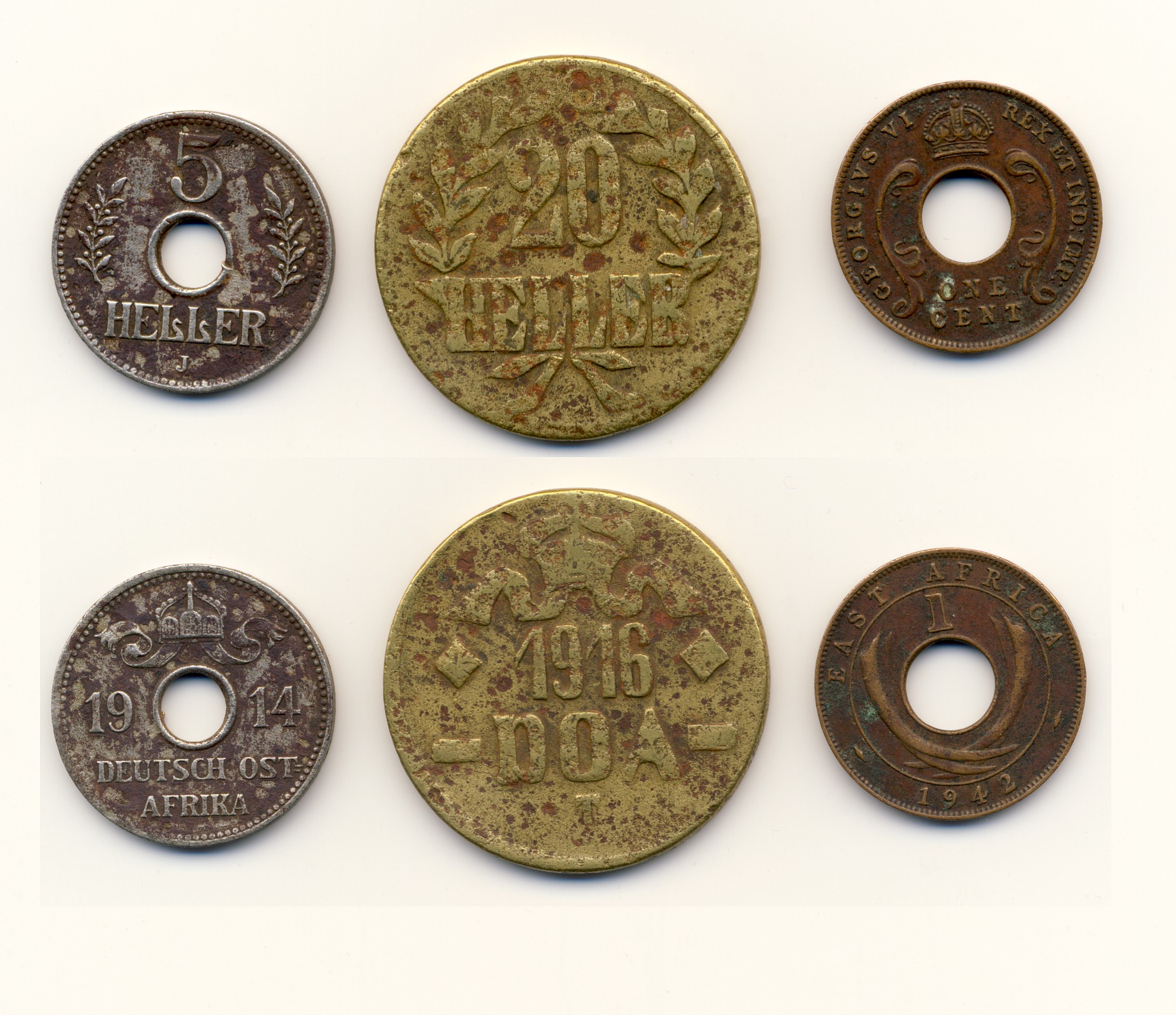Zum Schluß gibt es endlich ein paar Münzen. Solche aus deutscher und britischer Kolonialzeit aus Kupfer, Kupfer-Nickel, Bronze und Messing, kann man auch heute noch vor Ort handvollweise günstig erwerben. Schwieriger ist es mit Silbermünzen. Die Exemplare, die man dort vorfindet, sind allesamt sehr abgegriffen und preislich nicht viel günstiger als das, was man auf einschlägigen Auktionen zahlt. Ich habe deshalb meine Finger davon gelassen. Die drei Münzen, die Ihr auf dem Bild seht, stammen von meinem Tanga-Besuch in 2006. Links sehen wir ein 5-Heller-Stück von 1914J aus Cu-Ni (Jäger#718 / S#9 /KM#13), in der Mitte eine Münze aus der Notprägung von Tabora 1916 - Münzzeichen T – (Jäger#727b / S#18 / KM#15a) und rechts ein Stück aus der britischen Zeit in Ostafrika, einen Cent aus Bronze von 1942 unter George IV ohne Münzzeichen (S#27 / KM#29). Keine Prachtstücke und ganz und gar nicht selten, aber immerhin authentisch und persönlich mitgebracht.