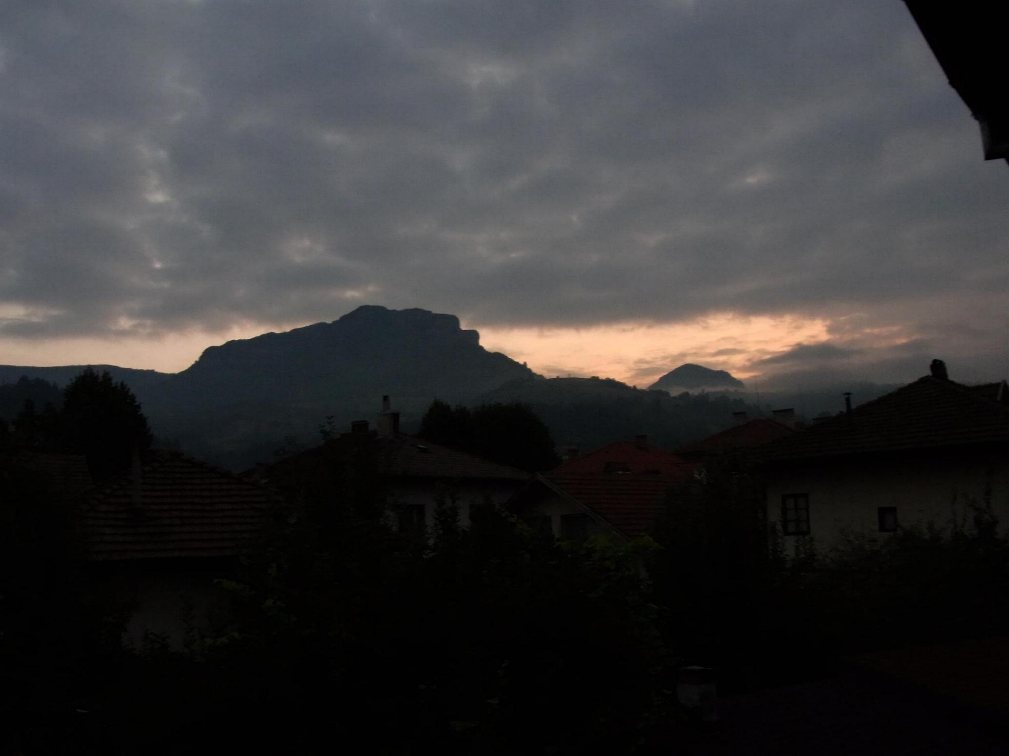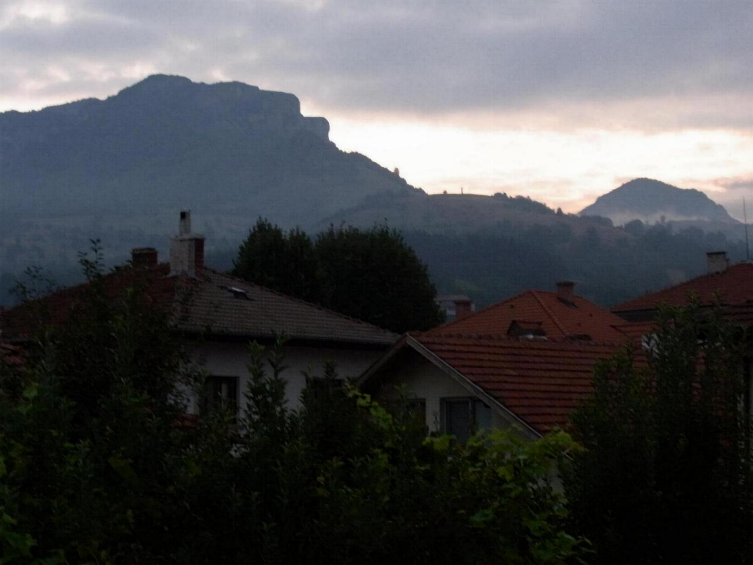 Das erste Bild entstand so gegen 5:20 in der Früh,es war bewölkt,bißl neblig (nachts hatte es geregnet). Der Berg den ihr hier seht, denn nennt man den "TSCHERVEN" (ЧEPBEH)= DER ROTE, ca. 1400m hoch . Im Hintergrund erhebt sich ein kleinerer Berg, genannt "KON" (KOH)=Pferd