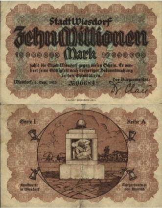 Am 1. September 1923 gab die Stadt Wiesdorf eine Serie (5 Stück, Reihe A bis E) von Notgeldscheinen zu Zehn Millionen Mark heraus. Hier liegt der seltene Fall von Serienscheinen bei Großgeldscheinen vor. Alle Scheine weisen die gleiche Vorderseite auf. Die Rückseiten sind nach dem Motto „Kunstwerke in Wiesdorf" gestaltet. Gemeinsames Wasserzeichen (75) Kölner Waben. Druckfirma M DuMont Schauberg Köln. Katalog: Hans Meyer - Das Papiernotgeld der Rheinprovinz. Die Darstellungen auf den Rückseiten: