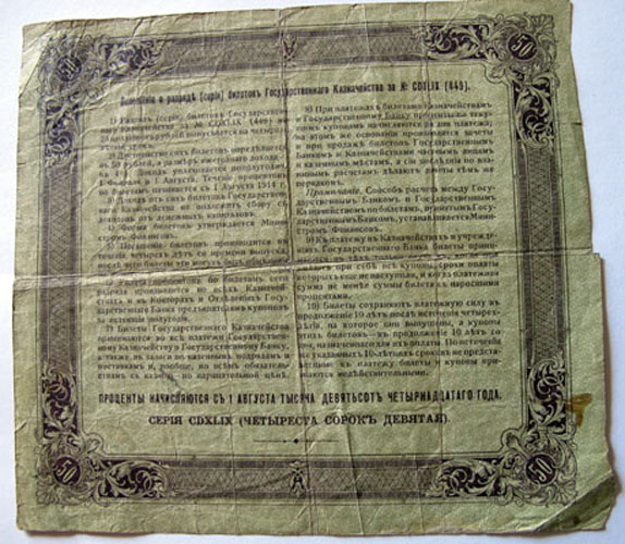 der großformatige Schein ist eine Schuldverschreibung (Obligation, erste Serie) über 100 Rubel (Schto Rublej) mit 5% Schuldverzinsung. Ausgegeben am 5. April 19... ist leider zu klein.