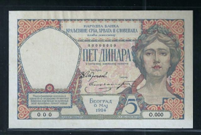 Die 3. Banknote von 5 dinara aus 1924, wurde im Paris (Frankreich) gedruckt. Sie sollte die Banknote aus dem Jahre 1919 ersetzen, aber dazu kam es nie, man lies von dieser Idee ab u gab 1926 die 10 Dinara Banknote aus, die dass selbe Design wie der Fünfer hate. Von dieser Banknote sind mir nur 2 Exemplare bekannt. Beide haben O 000.000 als Seriennummer.