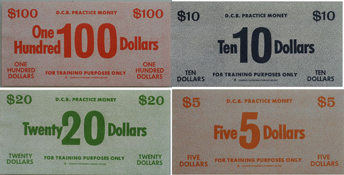 vor einigen Jahren erhielt ich nachstehende "Übungsgeldscheine" sogenannte Phantasiescheine. Sie sollten durch übungsgemäßen Gebrauch den Umgang mit einer neuen Art von Geldscheinen erleichtern. So wurde in Australien 1966 bei der Währungsumstellung von Pfund auf Dollar solches "Practice Money" ausgegeben.