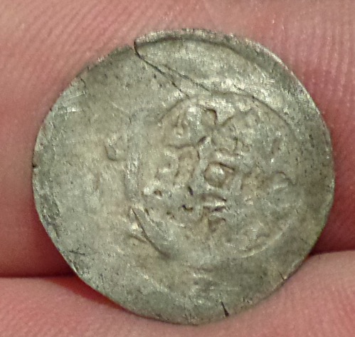 Münze 1 : Gewicht ca. 0,5g, Durchmesser: 17mm Pfennig (?) eine Seite mit der Abbildung einer Person mit Schwert (?) andere Seite eine florale Darstellung