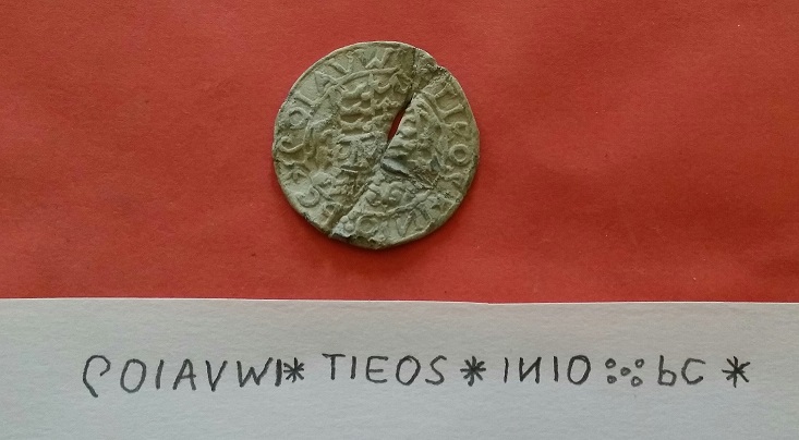 Die Umschrift ergibt absolut keinen Sinn und besteht aus teilweise verkehrten Buchstaben und wenigen Zahlen. Im Spätmittelalter hat man vieles aus Blei/Zinn-Legierungen angefertigt, wie Kreuze, Fürspane, Ringe, Doppelknöpfe, Beschläge,..... Die Umschrift ist aber nicht mehr gotisch, deshalb würde ich das Ding bereits ins 16. Jahrhundert stellen.