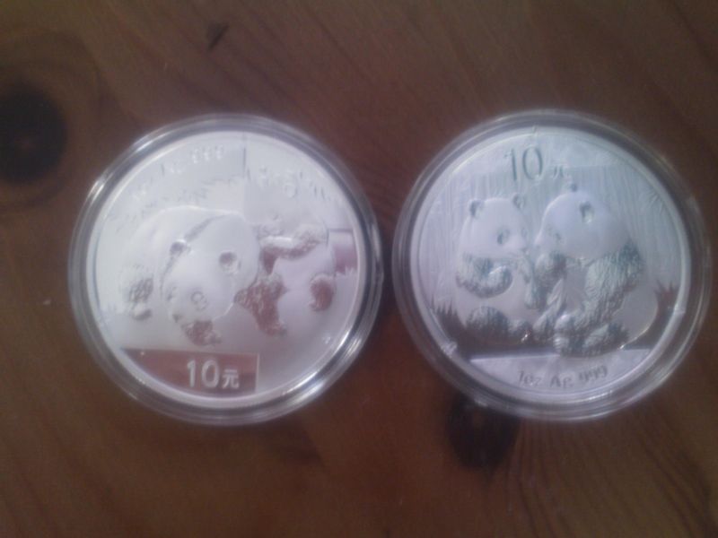 Die Münzen sind aus dem Jahre 2008 (links) und 2009 (rechts), eine Unze 999er Silber.