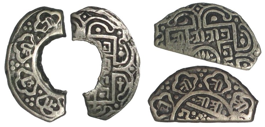 Ich zeige mal 2 Stücke zu einem drittel Mohar, der in Tibet als halber Sho "durchging". Bei dem größeren Stück lässt sich sogar die Jahreszahl SE 1697 (AD1775) noch gut erkennen. Man darf hier gern auch mal raten: Welches Stück wurde dem Zahlungsverkehr früher entzogen? Es gibt eine richtige Antwort und zwei sinnvolle Begründungen.