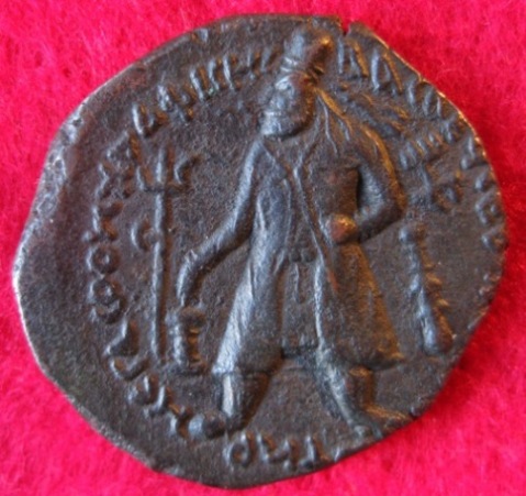 Ich habe auch 2 Tetradrachmen von Vima Kadphises. Die schönere der beiden stelle ich hier vor. Besonders interessant sind die verschiedenen Tamghas auf diesen Münzen. Die Tamghas und Nandipadas helfen auch bei der Zuordnung der Münzen zu bestimmten Herrschern dieser Zeit. Eine interessante, aber schwierige Materie.