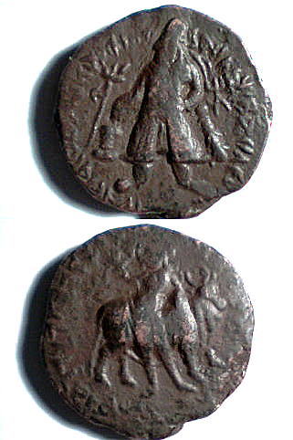 meine Querbeetsammlung wurde heute durch eine Bronze von Vima Kadphises bereichert, 17,17 gr. schwer, Durchmesser 30/28, bilingual (griechisch und karoshti), Münzstätte Taxila. Laut Vorbesitzer MAC 3040f (kann das jemand bestätigen oder korrigieren?) Die Vorderseite ist für diese Stücke ausgesprochen gut geprägt, so daß die Details gut zu erkennen sind.
