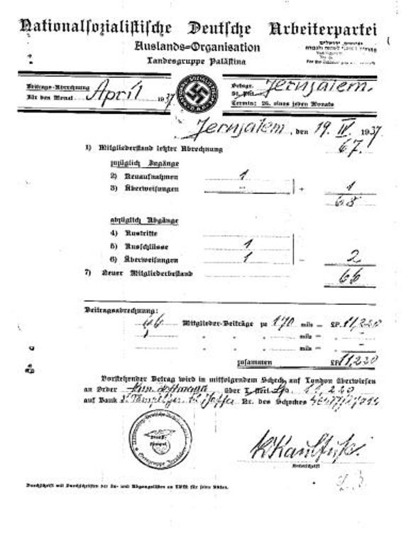 Jetzt noch ein skurriler Zufallsfund: 170 Mils kostete 1937 der Jahresbeitrag zur NSDAP Ortsgruppe Jerusalem.