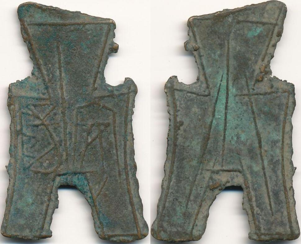 Ebenfalls etwa zu dieser Zeit tauchen die ersten Spaten und Messermünzen auf. Untergeordnet gab es noch Münzen in gebogener Form -> sogenannte Brückenmünzen, Münzen in Glockenform und Münzen in Fischform.