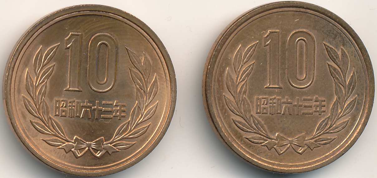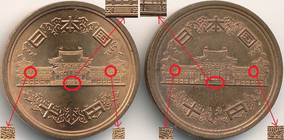 Im aktuellen JNDA-Katalog ist erwähnt, das es im Jahre 1986 (Showa61) 2 verschiedene Stempelvarianten der 10 Yen Münze gegeben hat, ohne jedoch auf Auflagenhöhen und Wertigkeit einzugehen. Hierzu fehlen sehr wahrscheinlich noch hinreichende Statistiken.
