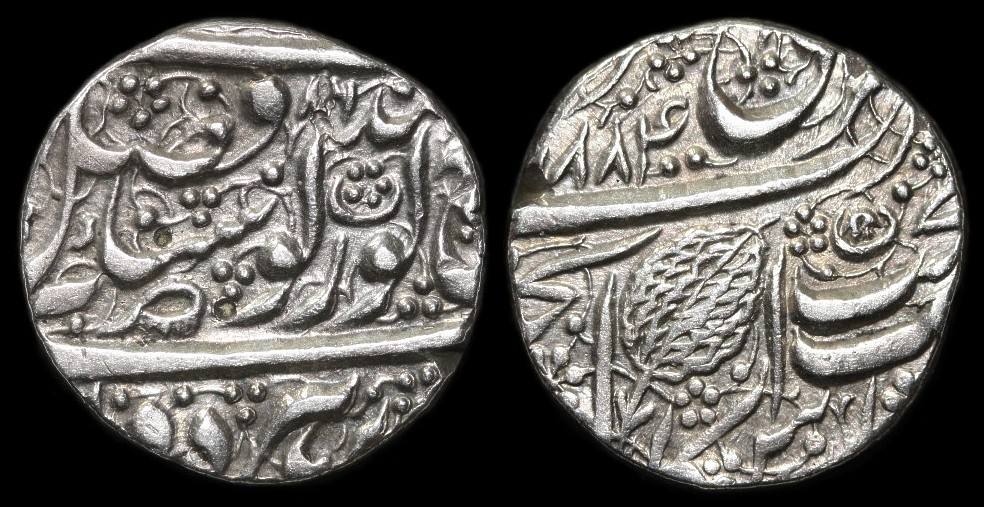 Als kurzen Ausblick auf die Vielfalt der indischen Münzen möchte ich hier eine weitgehend bekannte Rupie der Sikh vorstellen. Sie wird unter die besonders attraktiven Typen gezählt, vermutlich weil sie durch das Blatt-Motiv unserem Verständnis mehr entgegenkommt als andere rein kalligraphische Münztypen.