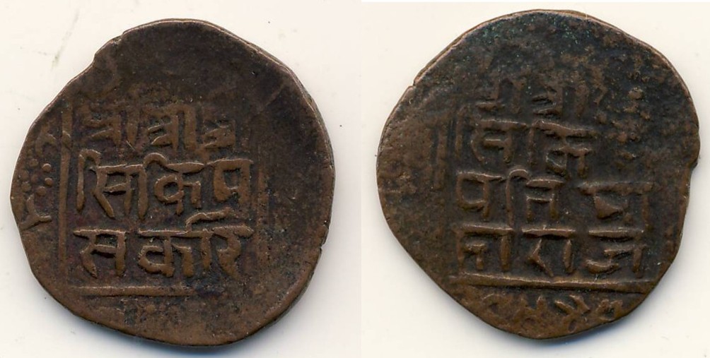 Die Münzen des Himalaja-Raumes sind - nach Afrika - eine weitere Region meines numismatischen Interesses. Von Nepal habe ich eine passable Sammlung zusammen, von Bhutan und Tibet sogar recht gute. Es gibt aber noch weitere Gebiete dieser Region, die sich nicht so leicht sammeln lassen. Eines davon ist Sikkim. Bei einem Münzhändler in England fand ich nun zu meiner großen Freude meine erste Münze aus diesem heutigen Bundesstaat Indiens, der von 1641 bis 1861 und von 1947 bis 1975 ein selbständiges Königreich war.